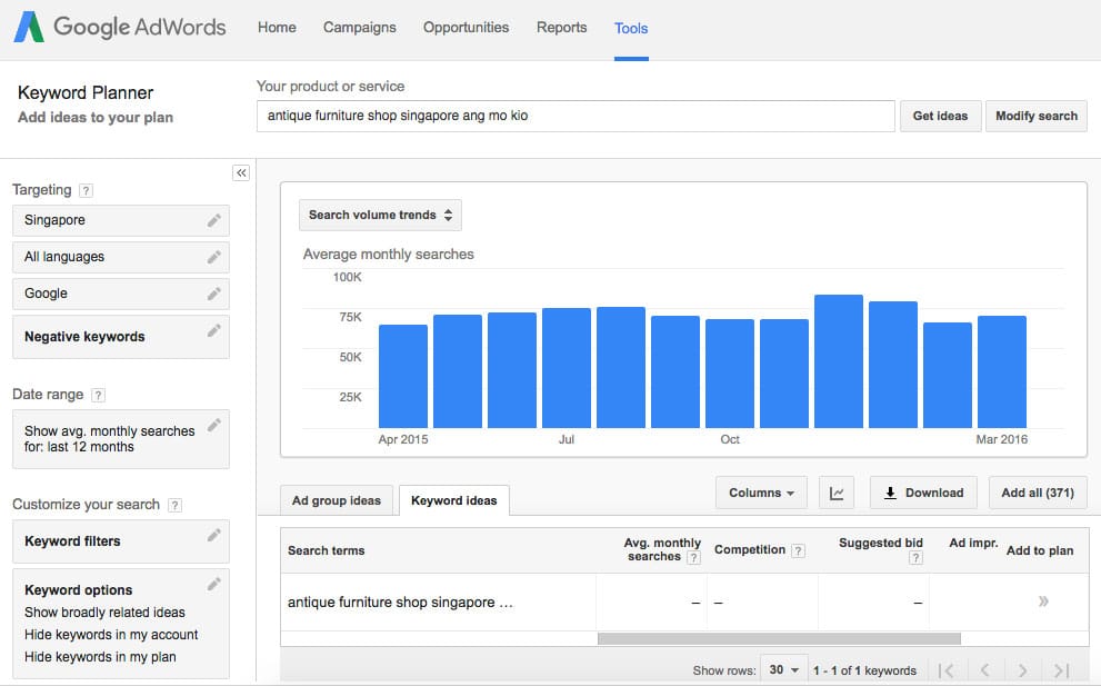 For example, if you sell furniture, you can easily get the top spot on Google for a keyword like “antique furniture shop singapore ang mo kio”. But this long obscure keyword doesn’t even have any searches on Google. That means no one is searching for this keyword. Take a look at the screenshot: