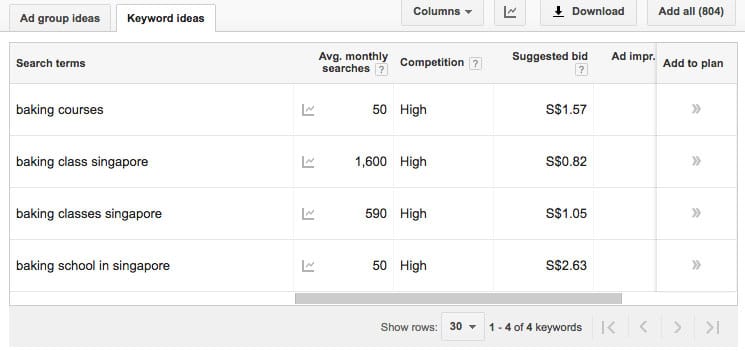 Imagine if they were to use Google Adwords to advertise for their baking class. How much would it cost them to acquire 48 sales? Let’s take a look at Google Keyword Planner’s data.
